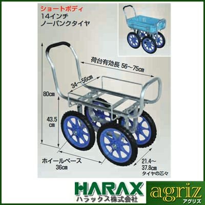 | ●ホイールベースが36cmと短いため、方向転換が楽におこなえます。 ●タイヤの直径が約34cmと大きいため、悪路での走行に最適です。 ●荷台面が約43.5cmと高いため、腰をあまり曲げなくても収穫物をコンテナに入れられます。 |