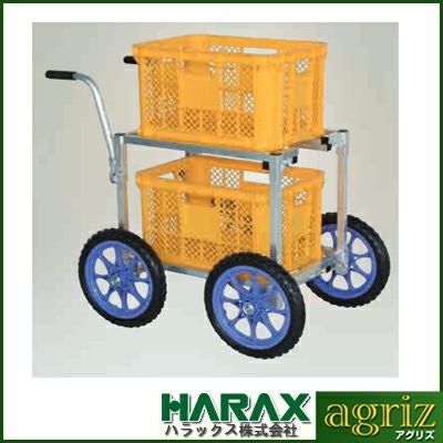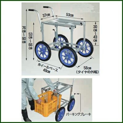 | ●高さ調節自在の上段前側に手の入るスペースが有り、下段でのコンテナの取扱いが楽にできます。 ●タイヤの直径が約34cmと大きいため、果樹園や悪路での走行に最適です。 ●パーキングブレーキ(ヘムロックBRA-120)が付いていますから傾斜地でも安心です。 |