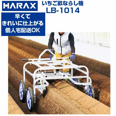 レベリー 移動式いちご畝ならし機 いちご用の畝を、畝上げ機で土上げした後に本体を移動させ、畝のベット部(上部)のレベルを合わせながら畝の形状を作り、整地する機械です。 タイヤ付の本体をセンターチェーンを目印に移動させながら作業できますから早くきれいに仕上がります。 レベリーの機能と作業手順 1-アジャスターのハンドルを回し、畝ならしユニットを上下させ畝の高さにセットし、土寄せ板の幅と角度を合わせる。次に成形板と均し板でカマボコ形か台形かお好みの畝の形状になるように合わせる。 2-本体を移動させながら下記の①~③の作業を同時に行う。 ①土寄せ板で畝上部の左右の土をセンターに寄せる。 ②成形板で畝の肩部分の形状をお好みの形に整える。 ③調製ノブでベット均し板を上下させベット上面の形状とレベルを合わせながら整地する。 |