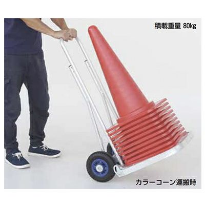 カラーコーン・フゴ等運搬台車 ●荷台面が幅50㎝ 奥行44.5㎝と広く、さらに脱着式のコーンストッパが付いていますから、工事作業現場で使用するカラーコーンやフゴ(ゴミ袋)等の運搬に便利です。 ●荷台面にコーンストッパを取付ければ、カラーコーンが倒れて落下するのを防ぎます。 ●荷台が簡単に折り畳みできますから、収納時場所を取りません。またコーンストッパがハンドル内側に収納できますから邪魔にならず紛失もありません。 |