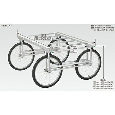 標準的なコンテナを最大10個搭載可能な万能作業台車です。荷台高さを調節できるのをはじめ、荷台ガード、車輪間隔も無段階調整を可能にし、多彩な用途に対応します。 |