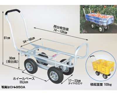 タイヤの直径が約35cmと大きいので、凸凹路面でも気にせず進めます!また、荷台面が約45cmと高いので、腰をあまり曲げることなく収穫物をコンテナに入れられます。