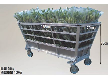 運搬用品とは、ハウス内の狭い場所や畑の畝間を通って収穫した作物を運搬するためのもので、多くはアルミ製で出来ており手押し式となります。