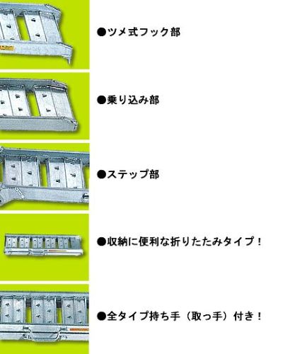 | ★総重量の確認 本体重量およびその他付属品、オペレーターの体重を含めた総重量が最大積載荷重の範囲内で、かつある程度余裕があれば安心です。 お薦めコメントはあくまで参考程度にお考えください。 ★最大積載荷重の表示について セット商品の場合は2本使用での最大積載荷重になります。 1本でご使用になる場合は表示の半分の最大積載荷重になりますのでご注意ください。 ★長さ選定の目安 設置角度が約15~20°になるような長さのアルミブリッジが推奨です。目安としてトラックの荷台高さの約3~3.5倍の長さが基準になります。 |