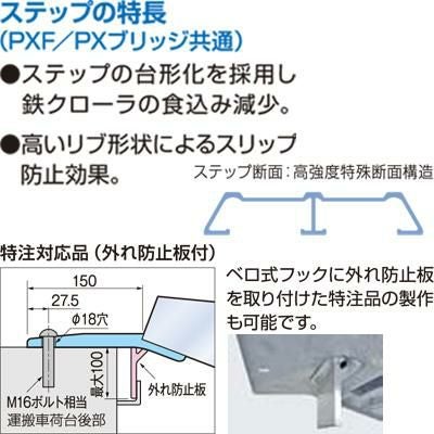 | ※こちらは鉄・ゴムクローラ兼用、および乗用タイヤにも対応しています。 ※50mm以上有効幅に余裕があることをご確認ください。 ※ブリッジのズレおよび落下防止のために、荷台後部にベロの穴をあわせて直径18の穴をあけ、付属のピンを差し込んでご使用ください。 ※ベロ式フックタイプは、平ボディー車・ダンプカー用です。セルフ車には使用できません。 ★総重量の確認 本体重量およびその他付属品、オペレーターの体重を含めた総重量が最大積載荷重の範囲内で、かつある程度余裕があれば安心です。お薦めコメントはあくまで参考程度にお考えください。 ★最大積載荷重の表示について セット商品の場合は2本使用での最大積載荷重になります。 1本でご使用になる場合は表示の半分の最大積載荷重になりますのでご注意ください。 ★長さ選定の目安 設置角度が約15~20°になるような長さのアルミブリッジが推奨です。目安としてトラックの荷台高さの約3~3.5倍の長さが基準になります。 |