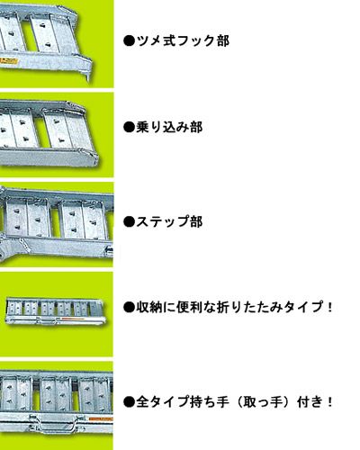 | ★総重量の確認 本体重量およびその他付属品、オペレーターの体重を含めた総重量が最大積載荷重の範囲内で、かつある程度余裕があれば安心です。お薦めコメントはあくまで参考程度にお考えください。 ★最大積載荷重の表示について セット商品の場合は2本使用での最大積載荷重になります。 1本でご使用になる場合は表示の半分の最大積載荷重になりますのでご注意ください。 ★長さ選定の目安 設置角度が約15~20°になるような長さのアルミブリッジが推奨です。目安としてトラックの荷台高さの約3~3.5倍の長さが基準になります。 |