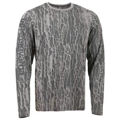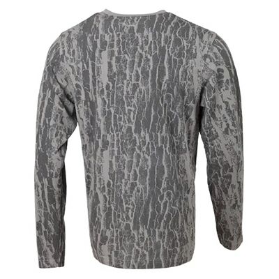 ハスクバーナのクラウンロゴが入った濃い緑色で、樹皮をイメージするプリントをあしらっています。着まわしの良い一着。