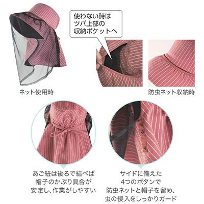 使用時にネットを取り出せる2way仕様! のらスタイル しまえるネット付き虫よけ帽 ピーチピンク