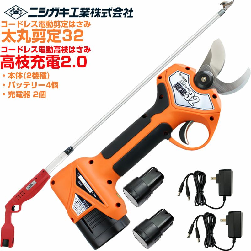 果樹・植木の剪定を劇的に効率化!手元も高所もこれ1セット!ニシガキ電動剪定&高枝充電フルセット (バッテリー4個付)高枝充電 全長1.0m。 手元も高枝も同じくらい使う方におススメ! 【在庫あり】 ニシガキ工業 太丸剪定32(N-772) & 高枝充電1.0(N-780) セット 電動剪定鋏 高枝切り プロ仕様 バッテリー合計4個付 充電式 最大切断径 32mm(高枝 26mm) 日本製刃 果樹 植木 枝打ち