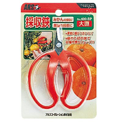 | ●みかんや果実の採集に。 ●丸い刃先は、デリケートな果物に傷がつきにくい設計です。 ●また、刃先が短いので細かな作業を難無くこなします。 ●優れた切れ味で、収穫作業がスムーズ。 |