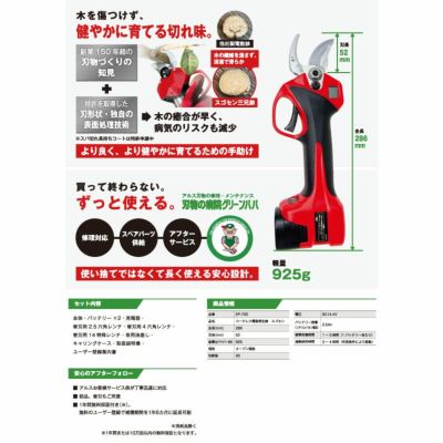 | ●発売以来大人気のアルス剪定鋏 EP-720がリニューアル! ●ハイパワーモーターを搭載し直径30mmまでの太枝の切断も可能になりました。 ●アルス独自の特許技術で磨き上げられた刃の切味は抜群! ●切断面を潰さずスパッと切るので癒合が早く病気リスクも減少 ●細い枝をたくさん剪定するときは、刃の開き幅が狭い「細枝モード」に切り替えも可能。 ●安全性能も進化!従来のトリガー追従式の刃に加えて安全センサーも装備。 ●切味抜群で使いやすい!日常的に選定作業を行うプロ向けの一台です! |
