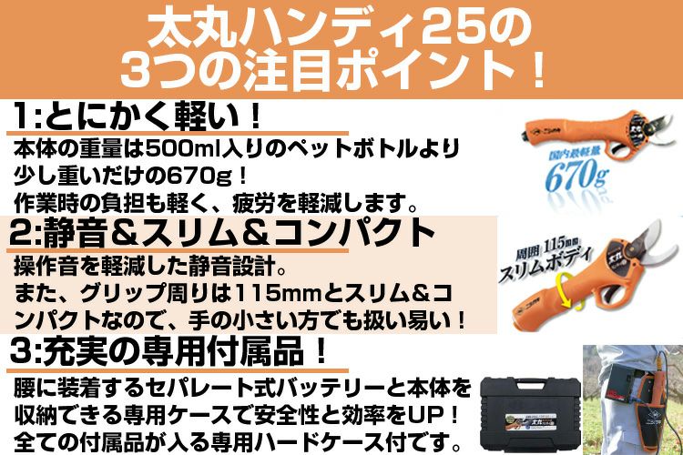 | 超軽量&コンパクト充電式剪定鋏の決定版! ●国内最軽量 本体の重さは、25mm切断可能クラスとしては国内最軽量の670g!作業の負担も軽く、疲労を軽減します。 ●切断可能本数約6000本 7.0Ahバッテリー満充電で、25mmの枝なら約2000本、15mmの枝なら約6000本切断できます。 ※参考数値であり、バッテリー状態や使用状況により異なります。 ●静音&スリム&コンパクト 操作音を軽減した静音設計。また、グリップまわりは、スリム&コンパクト。女性にも扱いやすい形状です。 ●0.2秒でφ25mmの枝を切断 指でトリガーを引くだけで、最大25mmまでの枝を0.2秒で切断できます、トリガーと刃は連動して.いるので、いつでも切断の中断・再開ができる安心の作りです、 ※1サイクル約0.4秒 ●ブラシレスモーター搭載 ブラシレスモーターの寿命は、驚異の5000時間以上!安定した性能を長くご使用いただけます。 ●高級刃物鋼+こだわりのメッキ仕上げ 刃は高級刃物鋼を使用し、ヤニ・サビに強いメッキ仕上げ(上刃:無電解ニッケルメッキ、下刃:クロムメッキ)替刃の交換も可能です。(別売) ●セパレート式バッテリー&専用ハサミケース付き 腰に装着するセパレート式バッテリーと、作業中に収納できる専用ハサミケースで、安全&作業効率アップ! ●専用ハードケース付き 全ての付属品を収納できるハードケース付き。持ち運びにも便利です。 |