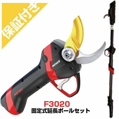 INFACO商品説明 ■更に軽く、更に速く! F3020は前モデルのF3015と比べて本体重量が約90g、バッテリー重量が約110g軽くなりました。 また、切断スピードは約15%アップしています! 更に軽く、更に速くなり、更に使い易くなった最新モデルの電動剪定バサミです! ■これまでにない快適さ! F3020のバッテリーベストは人間工学に基いて設計されており、非常に快適です! また、バッテリーはベルトのストラップや直接ポケットに入れて使用する事も可能。 一番作業しやすい方法で持ち運べるから不快感なく作業できます。 ■プロ仕様のバッテリー 仕様環境や作業内容にもよりますが、バッテリーは満充電で最大約8時間作業可能! 更に1.5時間で約90%、2時間で100%の充電が可能な急速充電器付! 仕事道具として使える性能を備えたバッテリーです。 ■作業に合わせて調整可能! 切る枝の太さに合わせて刃の開口部を10段階に調整可能! 標準キットの最大切断能力は約40mmですが、細枝を切る時は開口部を狭くして効率UP出来ます。 ■安全面も更に進化 トリガーとハサミ部分は連動してますので、より安全に作業できます。 また、素手でトリガーとハサミ部分を触ると刃が開き事故を未然に防ぎます。 より安全に作業できるように安全グローブセット(別売)もご用意できます。 新開発のハサミホルダーが標準装備なので、安全に持ち運び可能! ■充実したオプション品 切断できる太さを変える事の出来る替刃セット(ミディアムキット・マキシキット)や 高い枝の剪定作業の可能にする、延長ポール(固定式・伸縮式)等、切る枝や作業に合わせて、 豊富なオプション品をご用意しています。 |