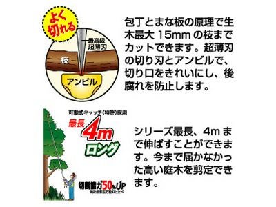 最大40mmまできれるパワータイプの高枝剪定はさみです。軽い力でトリガーを引くだけでスパッと枝が切れる!