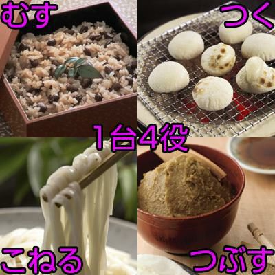 蒸すからつくまで「マイコン全自動」 水に浸したもち米をうすに入れて、キーを押すだけで「蒸す」から「つく」までマイコンで自動運転します。つき上がるとブザーがお知らせします。 蒸す・つく・こねる・つぶす「1台4役」 おもちをつくだけでなく、赤飯などを蒸したり、力仕事であるパン生地、ピザ生地、うどん生地のこね作業がキーを押すだけで簡単にできます。また、自家製みそを作るためのみそ羽根もついているので、1年中お使いいただけます。 簡単!無添加みそ作り。きめ細かくすりつぶす「みそ羽根」 2枝に分かれたみそ羽根は、形状と傾斜角度を工夫した象印独自の設計。背の高いはねが大豆をかき集め、うす形状に合わせた背の低いはねがきめ細かくすりつぶします。みそ作りで大変なゆでた大豆(500g)をつぶす作業がたった約5分でできます。 おもちの取り出しが簡単「とっ手つきうす」 |