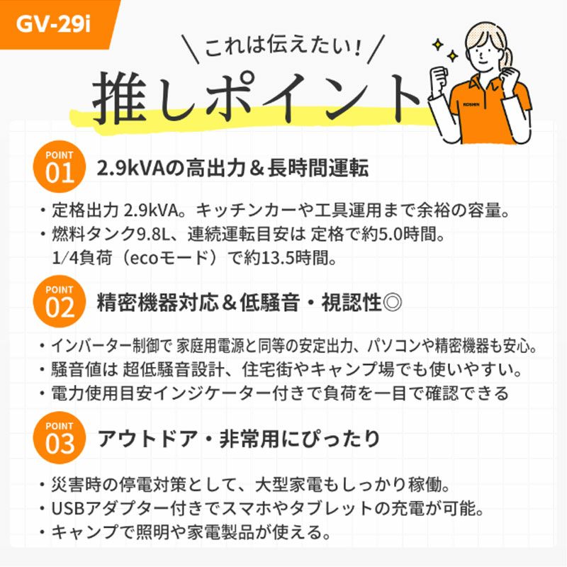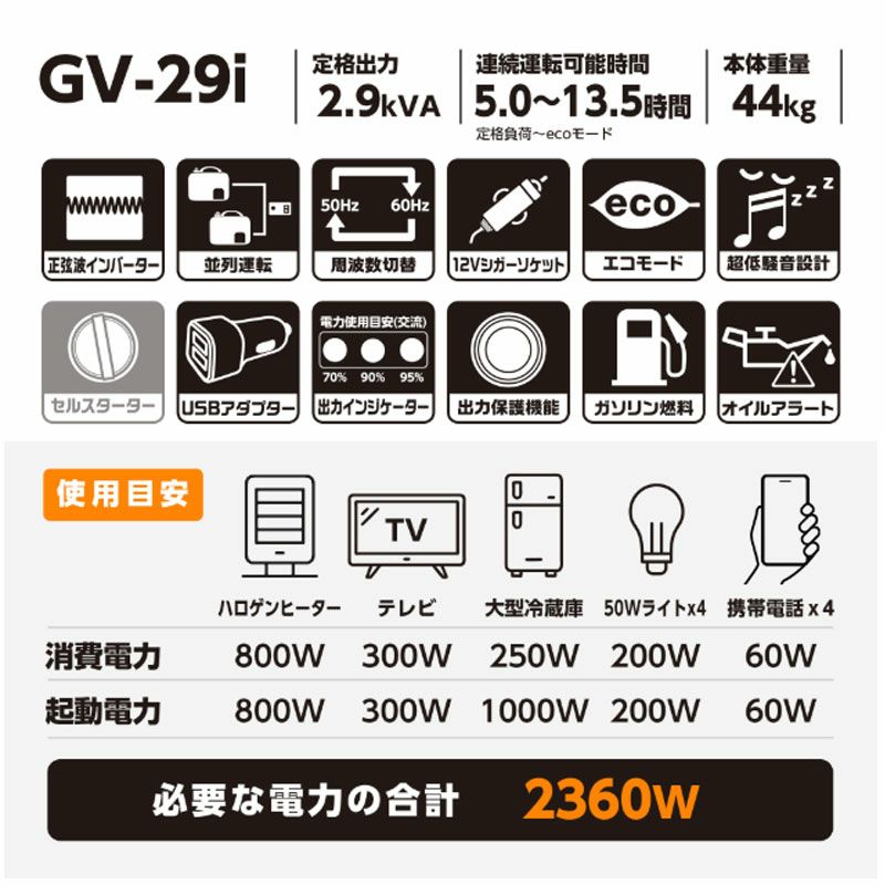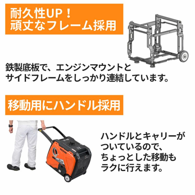 | 頑丈なのに軽くてコンパクト、移動もラクラクなインバータ発電機。 クラス最高の2.9kVAの高出力に加え、折りたたみのハンドルとキャリーを搭載し機動力も備えた工進のインバータ発電機。 ジャーから現場作業、もしもの時の予備電源まで、余裕の高出力で幅広く対応します。 正弦波インバーター搭載により、発電した電気の波形を整え、家庭のコンセントと同等レベルの高品質で安定した電気を供給、リチウムイオンバッテリーの充電や精密機器も安心してお使いいただけます。 また、12Vの直流電流が取り出せるので、クルマやバイク、トラクター、除雪機などの12Vバッテリーの充電も可能です。(※別売りの12V鉛電池充電ケーブルが必要です。) 鉄製鉄板でエンジンマウントとサイドフレームをしっかり連結、頑丈なフレーム採用でコンパクトながら耐久性も確保しています。 エコモード搭載で使用機器の負荷に合わせてエンジン回転数を自動制御。実用域での騒音を低減し、低燃費を実現。連続運転時間が大幅に向上します。 コントロールパネル部分にはクラス初の電力インジケーターを装備、使用電力が一目でわかります。 また、各種表示灯(オイル警告・過負荷警告)の点灯により故障診断が可能。発電機の状態確認、メンテナンスの管理が容易に行えます。 |