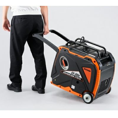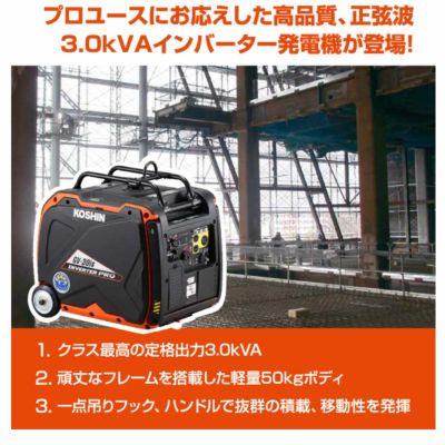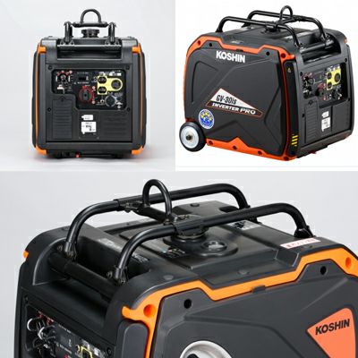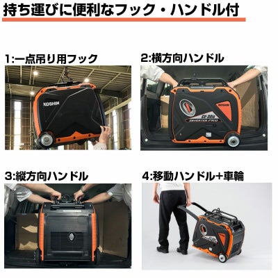 | プロユースにお応えした高品質、正弦波3.0kVAインバーター発電機が登場!! ●積載に便利な一点吊りフック、ハンドルを標準装備 ・一点吊りフック ・横、縦方向積載可能ハンドル ●セルモーター、マルチメーターを搭載 セルモータースイッチの保護ガード付き発電機の出力目安、電圧がデジタル表示整備時間の目安になる積算時間計の装備 ●プロユースに耐える頑丈なフレーム、移動ハンドルを採用 鉄製底板で、エンジンマウントと再度フレームをしっかり構成連結 |