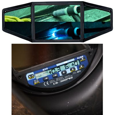 | ●日本初!180°パノラマワイドパネルの採用により新感覚の広い視野を3面同時に実現したアイボーグ180°にデジタル操作パネル搭載型が新登場!! ●従来品(EB-300PW)に比べ約70gの軽量化を実現し作業時の快適性が更に向上! ●オートモード(遮光度/感度/戻り速度の自動調整)により作業に最適な設定を瞬時に設定可能! ●フェードモードにより溶接箇所の残光を直視する事もなく高い安全性を実現! ●テストモード搭載により各遮光度を確認する事が可能な安心安全設計! ●WELD(溶接)GRIND(グラインド)モード切替スイッチを面体外側に取り付ける事で装着したままでのモード切替が可能に! ●EU規格最高評価取得の高性能液晶ブルーフィルタの採用により鮮明な視界に。 ●新型ワンタッチヘッドギアにより、更に高い作業効率に! |