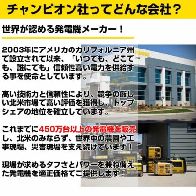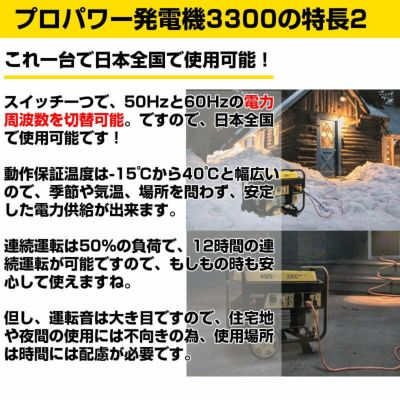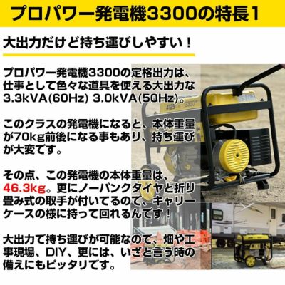 | ・Champion社の発電機は信頼性と耐久性に優れてたプロ仕様の発電機です。 ・定格出力3.3KVA(60Hz)の大出力ながら、重量は46.3kgに抑えられているので持ち運びも簡単です。 ・大型のタイヤと取手を装備しているので、スーツケースの様に取り回しが可能! ・インバータ搭載により、発電した電気の波形を整え、高品質で安定した電気を供給、PCや精密機器も安心してお使いいただけます。 ・動作保証温度も-15℃から40℃と幅広く、50Hz、60Hzのどちらにも対応しているので、日本全国で使用可能。 ・50%の負荷ならば、最大12時間の連続運転が可能。 ・農園や工事現場、野外イベント、今需要が増えているドローン機器の充電の為、更には災害現場での電源確保に優れた製品です |