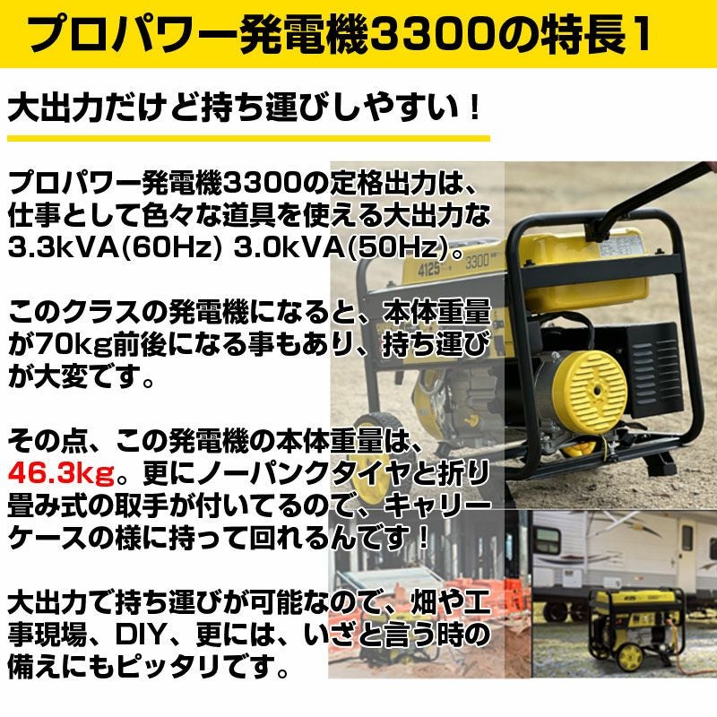 クラス最軽量(メーカー調べ)でコンパクトボディなのに、2.8kVAの高出力!持ち運びがラクなので、畑や工事現場等のプロの現場で大活躍!