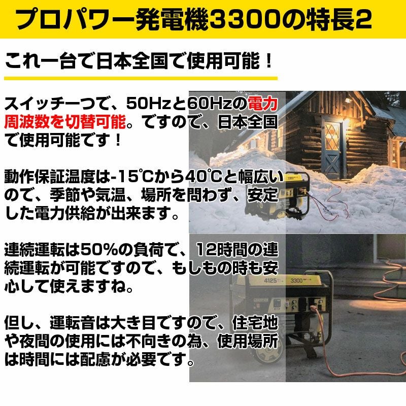 燃料があれば容易に100Vまたは200Vの電機を取り出せるため、災害時やレジャー、アウトドア、野外でのお仕事などで大変役立つ存在です。