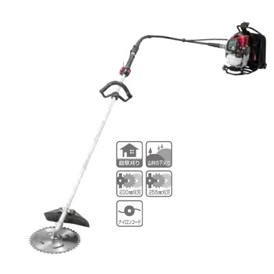 重いエンジンを背負うから腕にかかる負担が少なく作業が楽、平らな場所から斜面まで刈りやすい背負式刈払機。