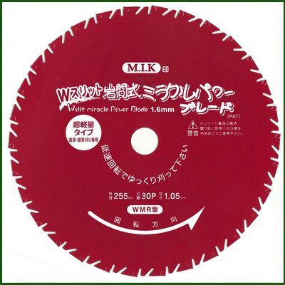 | 新開発Wスリットの効果とは・・・ 石礫・硬質異物と超硬刃先との接触時の衝撃を吸収する為の新たな本体形状の工夫です。スリットが一箇所から2箇所のWスリットになって衝撃吸収力が大幅に向上しています。 ●耐久性向上 本体をWスリット形状に変更しました。 ●異物飛散の減少 刃高を1.6mmにしています。 ●切れ味向上、軽量化 本体厚みを1.05mmにしました。 【用途】 畦草及び密生地等での雑草刈り専用(立木は切れません) ご注意:必ず低速回転で、ご使用ください。 【特徴】 ●低速回転使用でのソフトで軽快な切れ味・密生地での振り抜けの良さ飛び石の少なさ。燃費の良さ等・現行岩間式WM型の切れ味の良さの特徴を一段と向上させ、さらに軽量化も図っているチップソー刈刃です。 ●本体厚みは1.05mmとし超軽量化しています。 刃高は、1.6mmにしました。 ●さらに使用中の石礫等硬質異物と刃先の接触による衝撃をWスリット効果で吸収して刃先の欠ける現象を大幅に改善したチップソー刈刃です。 ご注意:「それでも保護眼鏡は必ず着用して下さい。」 ●長時間の雑草刈りが出来る耐久性・経済性を持っているので使い捨てでも惜しくないチップソー刈刃です。しかも簡単に目立ても可能です。 |
