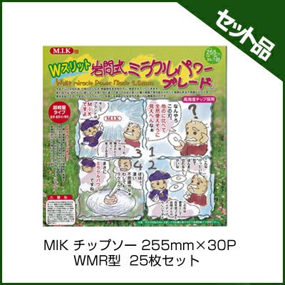 | セット内容 MIK チップソー 255mm×30P WMR型×25枚 ●新開発Wスリットの効果とは・・・ 石礫・硬質異物と超硬刃先との接触時の衝撃を吸収する為の新たな本体形状の工夫です。スリットが一箇所から2箇所のWスリットになって衝撃吸収力が大幅に向上しています。 ●耐久性向上 本体をWスリット形状に変更しました。 ●異物飛散の減少 刃高を1.6mmにしています。 ●切れ味向上、軽量化 本体厚みを1.05mmにしました。 【用途】 畦草及び密生地等での雑草刈り専用(立木は切れません) ご注意:必ず低速回転で、ご使用ください。 【特徴】 ●低速回転使用でのソフトで軽快な切れ味・密生地での振り抜けの良さ飛び石の少なさ。燃費の良さ等・現行岩間式WM型の切れ味の良さの特徴を一段と向上させ、さらに 軽量化も図っているチップソー刈刃です。 ●本体厚みは1.05mmとし超軽量化しています。 刃高は、1.6mmにしました。 ●さらに使用中の石礫等硬質異物と刃先の接触による衝撃をWスリット効果で吸収して刃先の欠ける現象を大幅に改善したチップソー刈刃です。 ご注意:「それでも保護眼鏡は必ず着用して下さい。」 ●長時間の雑草刈りが出来る耐久性・経済性を持っているので使い捨てでも惜しくないチップソー刈刃です。しかも簡単に目立ても可能です。 |