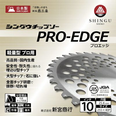 新宮商工純正、高品質国産チップソーのプロ用、軽量タイプ。 安全性、耐久性に優れるU型埋め込み、石に強く高耐久な大型チップを採用しています。 雑草から雑木、竹、笹までオールラウンドに対応可能な中心刃仕様。 スクイ、両側面、先端研磨で鋭い切れ味を発揮します。 信頼のJIS規格適合品です。 |