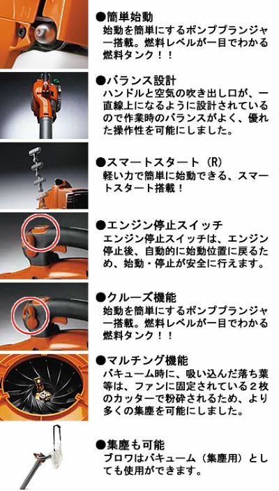 使い勝手がよく吹き飛ばす力の強い、効率的なハンディーブロワーです。バランスがよく、簡単に操作ができる設計になっています。スマートスタート(R)テクノロジーにより、始動が容易に行えます。フラットノズルとラウンドノズルが装備され、バキュームキット(集塵キット)も含まれています。