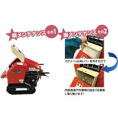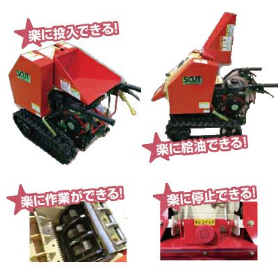 | 「らくらくスカット」が楽な理由 【特徴】 ●楽に作業ができる! ハンマー&ナイフとスクリーンを装備し細かなチップを排出! ●楽に停止できる! 手元でらくらくエンジン停止 ●楽に投入できる! 大きな投入口と食込みのよさ ●楽メンテナンスその1 上部カバーは工具なしで開閉できます。粉砕物が詰まっても楽に取り除くことができます。 ●楽メンテナンスその2 スクリーン止めレバーを外すだけで内部清掃や作業時の詰まりを簡単に取り除けます! ●楽に噛み込み解除ができる! 噛みこんだ材料もレバーを持ち上げるだけで簡単に取り除けます! ●楽に給油できる! 開閉式シュートは、給油やエンジンメンテナンスが容易! |