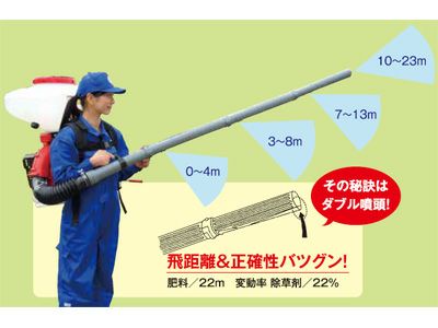 | 肥料・除草・消毒、一台三役の新型動散。 ●背負いやすい! ・業界No.1超低重心設計。 本体の高さを低く設計することで重心を下げ、安定しやすくしています。 ・本体を3度傾け調整。 背負いやすくバランスを崩しにくいよう、使用者側に向けて少し傾きをつけています。 ・考えぬかれたV字背あて。 身体にフィットするV字型のカーブで左右の揺れを防止。EVA(発泡プラスチック)採用で、腰にしっかり本体が乗る安定感バツグンの設計です。 ・機能的なベルトが2種類。 チェストベルトの位置を高く設定。アジャスターは真下に引けるため装着にも便利です。 ●タンクが使いやすい! ・業界No.1大き投入口。 φ213mmの大きな投入口。大サイズの肥料でもラクラク投入できます。 ・大容量タンク揺らさず投入スムーズ。 有機肥料20kg。タンクを揺らさず自然落下で肥料投入できるタンク形状にしました。 残量の視認性アップ。 透明度の高いタンクを採用。肥料の残量が見やすくなりました。 ・閉めやすいフタ。 本体にリブを設け、簡単にフタを閉められるよう配慮しました。 ●操作しやすい! 肥料散布・粉剤散布・1キロ剤散布が可能な調量3段階方式です。 ●伸縮式調量レバーで操作も収納もラクラク! 背負った時は、レバーを伸ばして操作しやすく! 運搬・保管時はレバーを縮めてコンパクトに! ストッパーをセットすれば、目盛りを見ずに調量レバーを設定できます。 ●畦畔から肥料・除草剤散布が可能! ●手撒きと比べ、時間が1/15に短縮&均一散布。 畦畔から散布できるため、手撒き作業の1/10~1/15の時間で均一に散布できます。 散布幅は0~25mです。(WY-25) |
