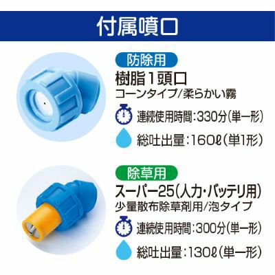 ● ダイヤフラム式で音が静か! ● 人力式を加圧するのが大変だった方に! ● 圧力スイッチ付 ● ダイヤフラム式ポンプのため、静音性に優れています。 ● 人力で加圧するのが大変な方におすすめです。 【付属噴口】 ● 樹脂1頭口 コーンタイプの柔らかい霧できめ細かく散布できます。 ス● ーパー25(人力用) 少量散布除草剤用 発泡ノズルのため、散布跡が白く撒きむらや重複散布を防止します。 |