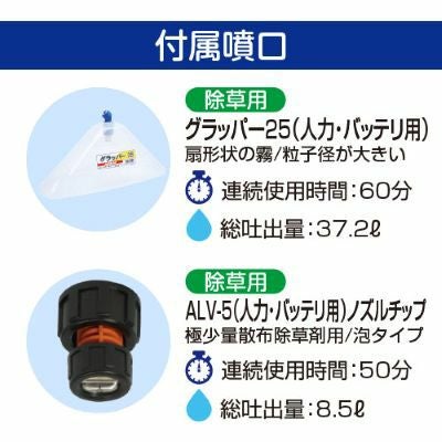 ● バッテリ動噴 10L クラス最軽量モデル! ● 使える除草剤散布用噴口が充実! ● ギヤポンプ搭載で圧力 0.3MPa の散布が可能です。 ● バッテリはカートリッジ式で簡単に着脱できます。 ● 充電はバッテリを専用充電器に差し込むだけで継ぎ足し充電も可能です。40分の充電で 50~60分 の散布が可能です。 【付属噴口】 ● グラッパー25(人力用) 少量散布除草剤用・扇形状の霧(飛散防止のカバー付き) 発泡ノズルのため、散布跡が白く撒きむらや重複散布を防止します。 ● ALV-5(人力用)ノズルチップ(高濃度少量散布ノズル) 少量散布除草剤用 粗い粒子のため風等で飛散しにくい仕組みです。 |
