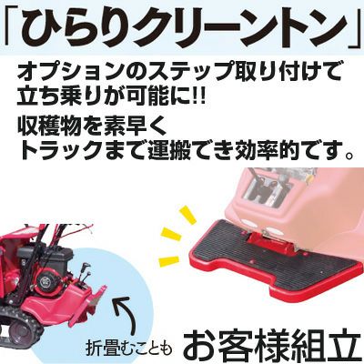 | 立ち乗り用ステップ「ひらりクリーントン」はお客様ご自身での取り付けとなります ●前ミッション 前ミッション方式により車体の前後バランスが良く、また立ち乗りにより前方視認性も高く、安心して走行できます。 ●ナ・ガ・ラミッション 最高速度は5.0kmながら、最低速度は0.25km(ハーフスロットル時)と超低速走行が可能ですので、狭い所でも安心して作業が行えます。 ●充実の足回り 低振動の芯金なしクローラに加えて、スイング転輪を標準で装備。凹凸路面での段差乗り越え時のショックをやわらげます。 ●可変ハンドル ハンドルの切り替えが3段階調整でき、オぺレータの身長に合わせた切り替えが可能です。 ●ロックンロールつばさ 側板に六角支点機能を採用。これにより側板の水平ロックが可能となり、荷台をより広く多目的に活用できます。 ●手動ダンプ |