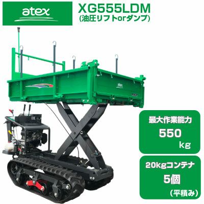クローラ 運搬車 アテックス XG655LDEB【最大作業能力650kg 20kgコンテナ最大6個(平積み) 油圧ダンプ 油圧リフト 運搬車 農業 キャタピラ ゴムクローラー エンジン 緑 箱型三方開 セル付三菱エンジン搭載 立乗りステップ付 クローラー 運搬車 土砂 資材 運搬 土木 不整地】