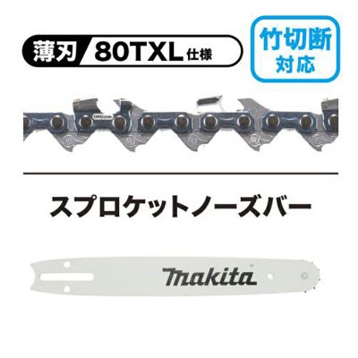 ガイドバーは10インチのスプロケットノーズバー、組み合わされるチェンは小型チェンソーの性能を最大に引き出すために作られたオレゴン80TXL。チェンピッチが.325ながらゲージ幅か1.1mmの「細い」チェンで切削効率が高く、パワーロスの少ないチェンです。