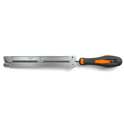 ヤスリをセットするだけで簡単に目立て角度を設定できます。プレートに刻まれた角度に従う事で、素早く正確に目立て作業を行える便利な工具です。