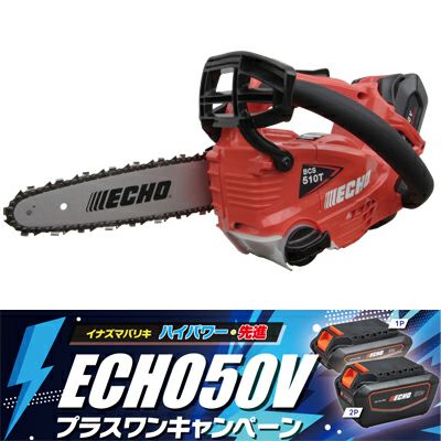 | プラスワンキャンペーン 今だけ!予備バッテリー付きモデルがお買い得。 期間限定2026年9月30日まで。 軽量&高出力。チェンソーメーカーが作ったバッテリートップハンドルチェンソー、BCS510T誕生。 各社がしのぎを削るバッテリーチェンソー市場において、他社メーカーに遅れを取っていたやまびこのエコーブランドから待望のトップハンドルチェンソーが発売されました。 バッテリー式だから「低振動」「低騒音」「排ガスゼロ」環境にやさしくストレスの少ないスマートな作業を実現します。 バッテリー装備状態でも、質量は2.7kg(※バーチェン除く)と徹底的な軽量化に加え、同社のエンジン式トップハンドルにも引けを取らないパワー、息継ぎの無いトルクフルな鋸断性能を持つBCS510Tシリーズ。 ハンドルレイアウトは枝打ち作業に便利な後傾リアハンドルレイアウトを採用、優れた重量バランスのおかげで、取り回し性も良く樹上作業も快適に行えます。 モーター冷却風取り込み口には粉塵の進入を防止する取り外し可能なフィルターを採用、モーターの状態を最適に保ちます。 他にも、チェン交換やチェンの張り調整時に便利なサイドアジャスター式チェンテンショナー、ナット脱落防止機構、リフティングフック部にはやまびこエコーオリジナルの「クイックドローシステム」を採用するなど、プロ用チェンソーを作り続けているやまびこならではの技術も満載。「プロ用」として、しっかり使えるバッテリーチェンソーとして仕上がっています。 キックバックへの対策には慣性作動式チェンブレーキを標準搭載、安全性にも考慮しています。 同じ50Vシリーズの刈払機やヘッジトリマーに使用できる共通バッテリーを採用しているので複数の機種に利用でき、無駄がありません。 非常に軽く滑らかな切れ味を持つ25APチェーンと8インチ(20cm)の先細スプロケットノーズバーの組み合わせとなります。 住宅街や公園での選定作業、庭や畑の果樹の剪定などあらゆるシーンで活躍します。2台目のセカンドソーとしてもおススメのチェンソーです。 オプションのスパイクバンパーが付いたセットになります。 ※スパイクバンパーのお取り付けはお客様で行っていただく必要がございます。 ※チェンソーの雨天時ご使用は推奨しておりません。 クイックドローシステムのご紹介はこちら↓ |