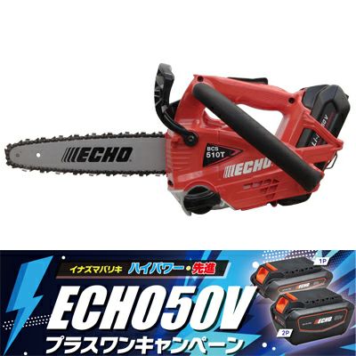 | プラスワンキャンペーン 今だけ!予備バッテリー付きモデルがお買い得。 期間限定2026年9月30日まで。 軽量&高出力。チェンソーメーカーが作ったバッテリートップハンドルチェンソー、BCS510T誕生。 各社がしのぎを削るバッテリーチェンソー市場において、他社メーカーに遅れを取っていたやまびこのエコーブランドから待望のトップハンドルチェンソーが発売されました。 バッテリー式だから「低振動」「低騒音」「排ガスゼロ」環境にやさしくストレスの少ないスマートな作業を実現します。 バッテリー装備状態でも、質量は2.7kg(※バーチェン除く)と徹底的な軽量化に加え、同社のエンジン式トップハンドルにも引けを取らないパワー、息継ぎの無いトルクフルな鋸断性能を持つBCS510Tシリーズ。 ハンドルレイアウトは枝打ち作業に便利な後傾リアハンドルレイアウトを採用、優れた重量バランスのおかげで、取り回し性も良く樹上作業も快適に行えます。 モーター冷却風取り込み口には粉塵の進入を防止する取り外し可能なフィルターを採用、モーターの状態を最適に保ちます。 他にも、チェン交換やチェンの張り調整時に便利なサイドアジャスター式チェンテンショナー、ナット脱落防止機構、リフティングフック部にはやまびこエコーオリジナルの「クイックドローシステム」を採用するなど、プロ用チェンソーを作り続けているやまびこならではの技術も満載。「プロ用」として、しっかり使えるバッテリーチェンソーとして仕上がっています。 キックバックへの対策には慣性作動式チェンブレーキを標準搭載、安全性にも考慮しています。 同じ50Vシリーズの刈払機やヘッジトリマーに使用できる共通バッテリーを採用しているので複数の機種に利用でき、無駄がありません。 非常に軽く滑らかな切れ味を持つ25APチェーンと10インチ(25cm)の先細スプロケットノーズバーの組み合わせとなります。 住宅街や公園での選定作業、庭や畑の果樹の剪定などあらゆるシーンで活躍します。2台目のセカンドソーとしてもおススメのチェンソーです。 ※雨天時のご使用は推奨しておりません。 クイックドローシステムのご紹介はこちら↓ |