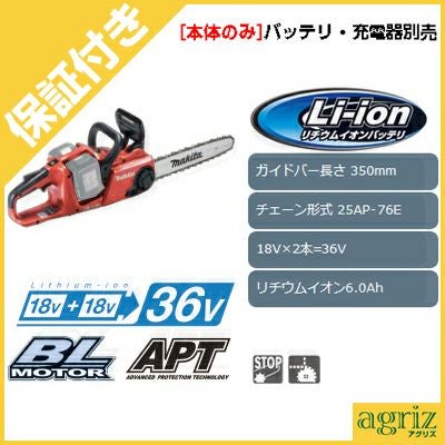 高出力+高回転、30mLエンジン式と同等の使用感! 【プレミア保証付き】 【マキタ】 MUC353DZFR 充電式チェンソー チェーンソー 【本体のみ】 【14インチ(35cm)スプロケットノーズバー】 【25AP仕様】 【バッテリー・充電器別売り】