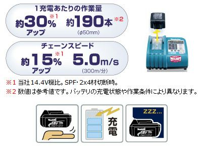 | バッテリBL1830・充電器DC18RA・プラスチックケース付 [約22分充電] 18V リチウムイオン 3.0Ah コードレスならではの機動性。薪切り、枝払いに! 作業量30%&切断スピード15%アップ工具レスチェーン刃交換。※当社14.4V機比。 ●18V Li-ionバッテリ搭載でより多く、より早く切断! ●コンパクトなトップハンドル形状! グリップとチェーン刃が近く荷重がかけやすい。 握りやすく横向き作業も安定します。 ●簡単・便利 工具レス チェーン刃交換・締付け! ノブを回すだけで、簡単にチェーン刃の交換が行えます。 また、ノブを少し緩めるだけでチェーン刃の張り調整が行えます。 ●チェーンオイル自動給油! チェーン刃の寿命&切れ味UP! 自動的にチェーン刃へオイルが供給されます。 オイルタンクは、バッテリ1充電での作業量分を確保しました。 (マキタ純正チェーンオイル使用の場合) ●チェーンオイル注入口 ハンドガード チップガード 枝を切り上げするのに便利で、キックバック防止にもなります。 ロックオフボタン 金属フック 電気ブレーキ ●リチウムイオンバッテリ搭載! <バッテリ寿命までの総作業量約3.3倍> (当社従来機比) デジタル通信でリチウムイオンバッテリを最適充電でき、ニッケル水素差込み式バッテリに比べ、バッテリ寿命までの総作業量約3.3倍。 <小型・軽量> <継ぎ足し充電が可能> メモリ効果がないため、継ぎ足し充電が可能になりました。 <長期保存に強い> 自己放電が少ないため、長期保存しても満充電に近い作業が可能です。 ※満充電状態で保存してください。 |