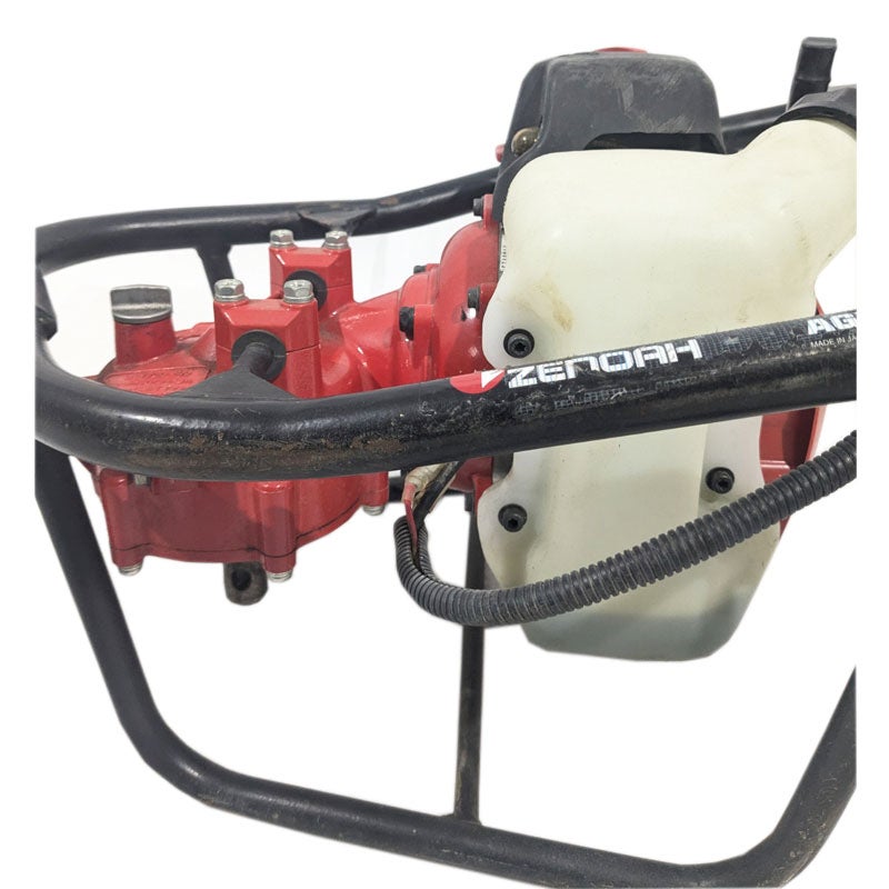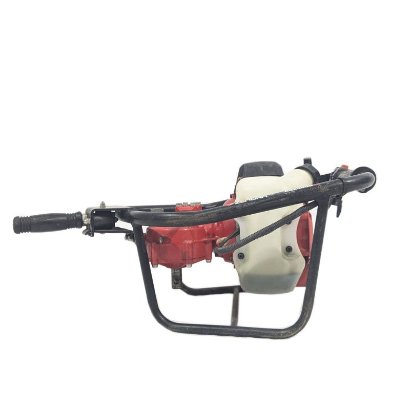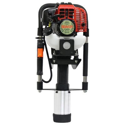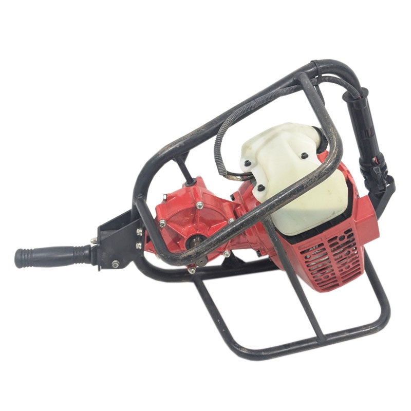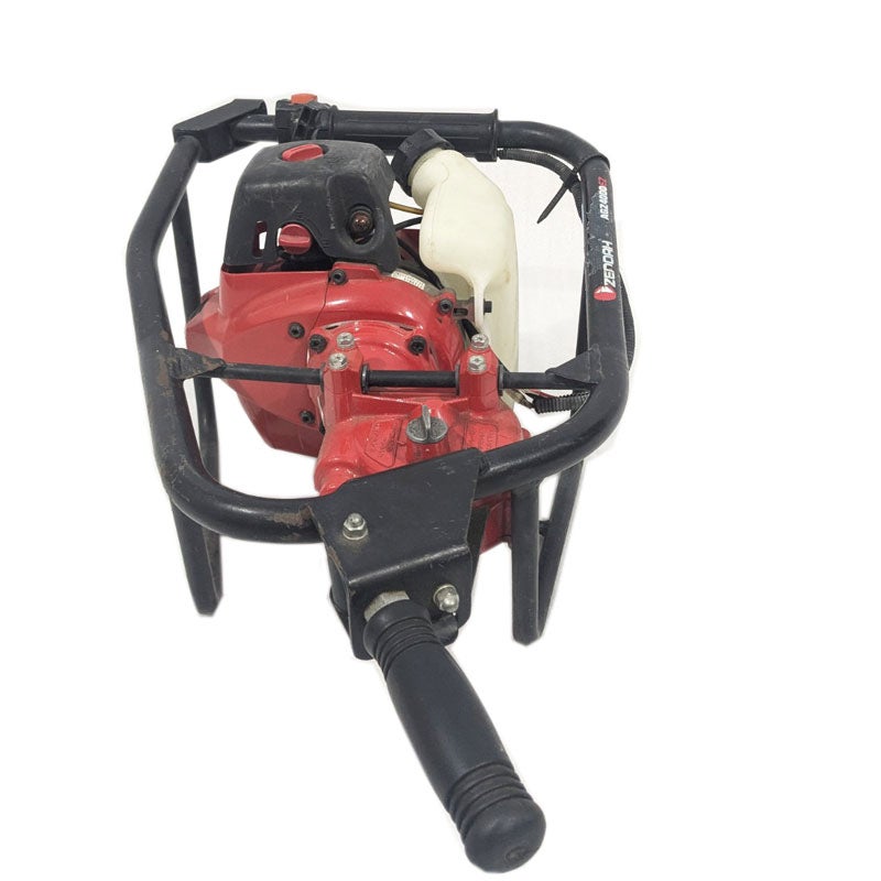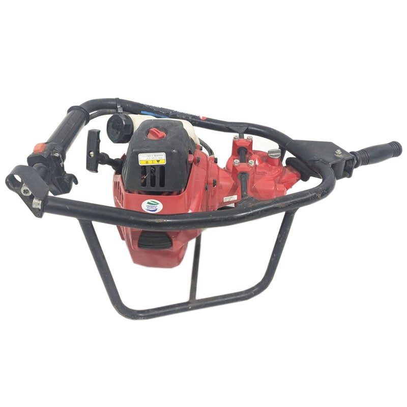 エンジン等の動力でドリルを回転させ、畑の杭打ち用の穴を空けたり工事現場での土木作業に使われる機械で、正式には「アースオーガー」という名称の機械です。