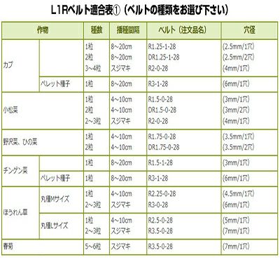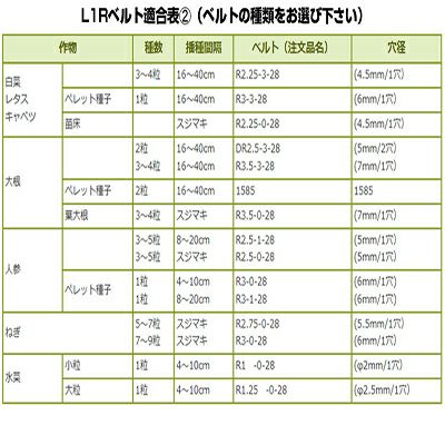 HS-802は省力化できる2条タイプ。 畝の上やハウス内での多条播種に最適です。 ほうれん草、小松菜、水菜、人参など条間の狭い野菜に向いた機種です。 【特徴】 ■繰り出し部は“ごんべえ”独自のベルト繰り出し方式を基本に、落下位置を低くし、より的確な播種ができます。 ■特殊リンクベルト採用により、1点1播きが可能に!種子代が節約でき、間引きの必要も無く省力化が図れます。 ■カセットにツメグルマを採用することにより、ベルトが確実に回転。安心して作業ができます。 ■ベルト駆動部分に、一方クラッチを採用することにより、ベルト駆動輪(前輪)が逆転した場合にベルトは回転せず、安心して作業ができます。 ■ベルトの交換により、小粒種子(カブ等)、芽出し種、コーティング種子も傷めず、高精度に播種ができます。 ■ベルト角度の調節と付属ギアの交換で、播種量と播種間隔(8通)が、間単に調節できます。(2条タイプは2条同時調節、条止め機構付き) ■溝切りはダブルディスクの為、草や堆肥のからみつきが無く、土壌条件を選びません。 ■前輪に大径車輪、スパイク付きで土を選ばず、前後輪外周がウレタンフォーム貼りの為、土の付着が有りません。 ■条間の変更は、ハンドルを緩めるだけで、簡単に変更できます。(2条タイプ) |