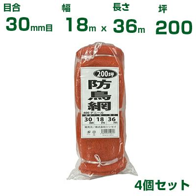 シンセイ 防鳥網 (オレンジ) 18X36m 目合30mm 4個セット(防鳥ネット)(鳥害対策)(鳩)(カラス)(防鳥網)(農業用)(園芸用)(農業資材)(家庭菜園)