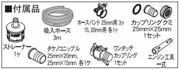 | 付属品 | ストレーナー:1個、吸入ホース:3m、ホースバンド25mm:3個、ホースバンド20mm:1個、ホースバンド15mm:1個、カップリングクミ25×25mm:1、セットワンタッチカップリングクミ25×25mm:1、セットタケノコニップル25×20mm:1個、タケノコニップル25×15mm:1個、エンジン工具:1式 |