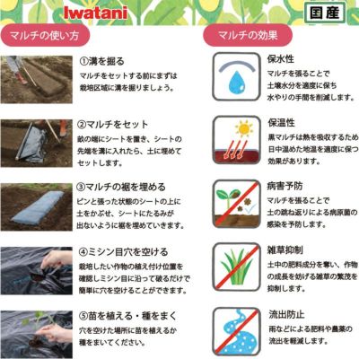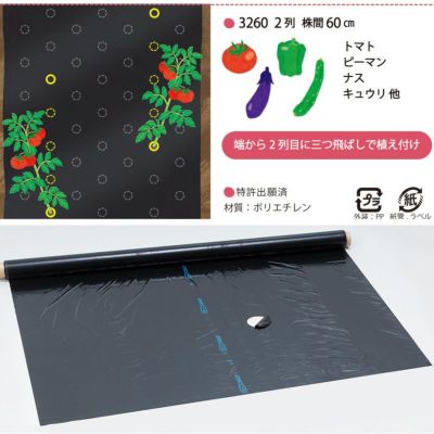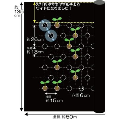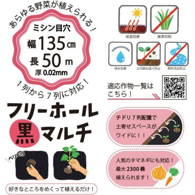 好きなミシン目穴をぺリッとめくって植えるだけ! 植え付け位置が5列チドリ配置に変わって、生育領域を確保しつつ、よりたくさんの野菜が植えられるようになりました。 人気の野菜50品目を網羅!! ミシン目に沿って破るだけで、簡単に植え穴をあけることができます。 好きな場所に植えられるので、いろいろな作物を同時に栽培できます。 保温性の高い「黒マルチ」、防虫効果の「シルバーマルチ」、地温を抑える夏場に最適な「白黒マルチ」をラインナップ。 株間別作物例 5列15cm株間 タマネギ、ニンジン、ホウレンソウなど 1列30cm株間 キャベツ、ジャガイモ、イチゴ、サツマイモなど 2列30cm株間 ダイコン、トウモロコシ、オオバ、レタスなど 1列60cm株間 トマト、ピーマン、ナス、キュウリなど その他さまざまな作物が植え付けが可能です! ポイント 1 配列の変更 95cm 幅のマルチは3列チドリから5列チドリへ。135cm 幅のマルチは4 列チドリから7列チドリへ。 配列をリニューアルすることで生育領域を確保しつつ、従来品より総植え付け穴数が1.6倍! 小型の人気野菜、タマネギやニンジンも十分に植え付けできるようになりました! ポイント 2 畝立てしやすい土寄せスペースを確保! 配列の変更に伴いミシン目穴が増えましたが、"穴あき黒マルチ9515"(タマネギ対応品)よりもすそ幅が広いため、畝たてがしやすいです。 ポイント 3 ミシン目穴の「破れにくさ」と「めくりやすさ」を両立!! 新しい技術導入と独自製法により、展張時は破れにくく穴をあける時はペリっと簡単にミシン目穴が破れる仕様になりました。 ポイント 4 人気作物50種類を網羅! これ一本でほとんどの野菜が植えられます。 ラベルもポップなデザインにリニューアル! 裏面には人気作物50種類以上を網羅した植え付け図を記載していますので畑で確認しながら植え付けができます。 |