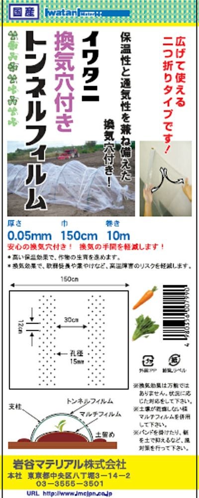 保温性と通気性を兼ね備えた換気穴付き!広げて使える二つ折りタイプです! 岩谷 イワタニ 菜園用 換気穴付 トンネルフィルム 0.05mm X 150cm X 10m 農業資材 園芸用品 家庭菜園 保温 通気