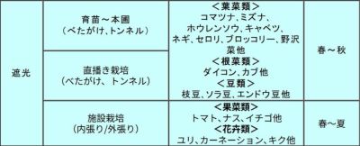 | ビニロン(PVA)糸を使用している<クレモナ>寒冷紗は防虫効果はもちろんのこと、1)遮光効果2)蒸散 防止効果3)保温効果4)防風効果に優れ、そ菜類の育苗・トンネル栽培、台風対策に適しています。 防虫ネットとは一味違う<クレモナ>寒冷紗 です。 適度な遮光&蒸散防止 ●遮光率の比較 <クレモナ>寒冷紗はポリエチレン品より遮光率が高く強い日ざしをさえぎります。 ●蒸散防止効果 <クレモナ>寒冷紗とポリエチレン品では約2割程度の保湿力の差があります。 ●防虫効果 毛羽効果でより一層の防虫効果を発揮します。細かい害虫もシャットアウト! ●風雨による被害の軽減 台風などの強風雨から作物を守ります。特に<クレモナ>寒冷紗は吸湿性に優れるため、塩害対策にも効果があります。 冬どり~春どり栽培にも ~<クレモナ>寒冷紗は放射冷却を防ぐ人工の雲~ ●保温性 赤外線の透過性が低いため、夜間の保温性には特に優れています。 【使用上のご注意】 ●雨などで濡れると、乾く時縮みますので、余裕をみて張って下さい。縮み率 白6%程度、 黒4%程度。 ●支柱、あるいは留め具などと擦れるといたみますので、<クレモナ>寒冷紗と接触する部分は滑らかな面にして下さい。 ●縫い合せには耳の厚くなっている部分を利用して下さい。 ●人や重量物をささえたり落下防止用途には、使用しないで下さい。 ●火気厳禁。燃えやすいので、火気の近くでは使用しないで下さい。 ●表示された用途以外には、使用しないで下さい。 ●育苗~本圃(べたがけ、トンネル) ●直播き栽培(べたがけ、トンネル) 対象作物: <葉菜類>コマツナ、ミズナ、ホウレンソウ、キャベツ、ネギ、セロリ、ブロッコリー、野沢菜他 <根菜類>ダイコン、カブ他 <豆類>枝豆、ソラ豆、エンドウ豆他 使用時期:春~秋 ●施設栽培(内張り/外張り) 対象作物: <果菜類>トマト、ナス、イチゴ他 <花卉類>ユリ、カーネーション、キク他 使用時期:春~夏 ●施設栽培(内張り/保温・遮光兼用) 対象作物: <果菜類>トマト、ナス、ピーマン他 <葉菜類>ミツバ、ネギ他 <花卉類>バラ、カーネーション、キク、ユリ、シクラメン他 使用時期:通年 |