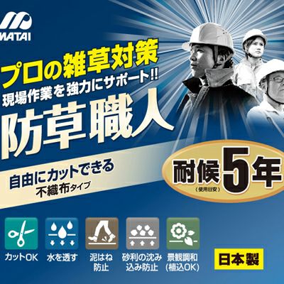 | プロが認めた雑草対策 現場作業を強力にサポート!! 防草効果を長期間維持し、草刈りの手間を大幅に軽減!! ●透す 空気、水、栄養分を透し、土壌が蒸れず、土を傷めません。 ●遮る 太陽光を遮断し、植物の光合成を抑制します。また、飛来種子の成長を防ぎ、シートの雑草は、押さえ込みます。 ●支える パークチップや砂利下の沈殿を防ぎ、補充コストを軽減します。 【使用上の注意事項】 ●火気に近づけないでください。軟化や変形する恐れがあります。 ●使用しない時は、屋内の冷暗所に保管してください。 ●当製品は、シートの遮光性を利用して雑草の繁茂を抑制するものです。シートに直接雑草を枯らす効果はありません。 ●効果やシートの耐久性は使用状況や環境などにより異なります。 ●十分な透水性を発揮するまでに少し時間がかかる場合があります。 ●当製品は、竹笹類の防草には適しません。 【施工上の注意事項】 ●多年生の強壮雑草は、地下茎に養分を保持し生長します。抜根処理や土壌改良、除草剤の散布などの整地作業の上、施工してください。 ●周辺に多年生強壮雑草の密生地がある場合、土壌の抜根処理を推奨します。地下茎により、施工場所へ雑草が侵入してくる恐れがあります。 ●シートが風で飛ばされないよう、固定ピンや重石等で地面にしっかリ固定してください。シートの重ねしろには、風の吹きこみによリシートのめくれの恐れがありますので、端部と同様に必要に応じて固定ピンの本数などを増やしてください。 ●強風、降雨、降雪時の施工は避けてください。 ●シートをハサミなどでカットする際は、怪我のないようご注意ください。 ●重機や車両の乗り入れなど、極度のストレスがかからないようご留意ください。 |